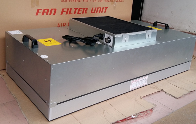 FFU工作通電后,風機運轉,離心風機將空氣吸入,空氣到達FFU靜壓箱內,利用風機壓力的作用空氣到達高效率過濾,通過高效率過濾后的空氣達到100級(美國聯邦209E標準)然后均勻地送出。