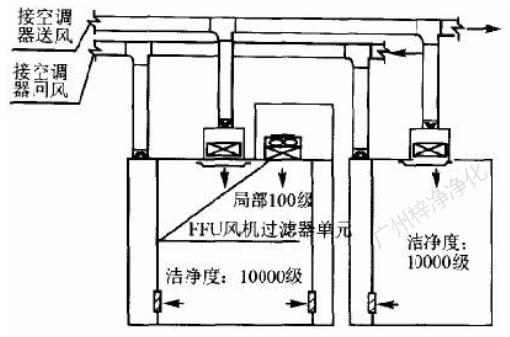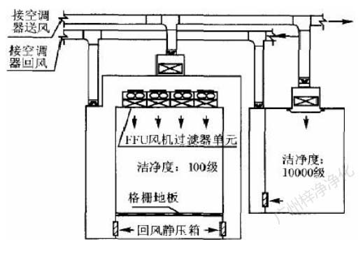 此方式的缺點是設置循環(huán)風機箱及處理噪聲,需要較大的空間,而通常百級區(qū)周圍風管都比較密集,需要精心布局。此方式百級區(qū)上部靜 壓箱相對百級區(qū)室內為正壓,頂棚高效過濾器與吊架間的滲漏,為靜壓箱流向室內,直接影響百級區(qū)潔凈度。對施工質量要求較高。(具 體可參考: