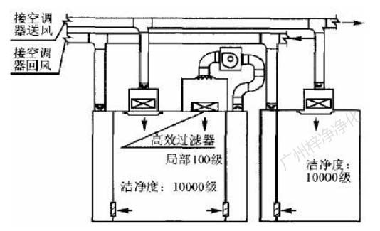 第三種方式,萬級區(qū)潔凈房間內含局部百級區(qū)。此種情況在藥品生產(chǎn)廠房潔凈區(qū)內也比較多見。這種情況,局部百級區(qū)面積一般在10m2 以內。可以利用萬級凈化空調系統(tǒng)送風控制室內溫、濕度,補充新風。在局部百級區(qū)加大循環(huán)風量。循環(huán)風處理方式可以采取前述方式 一,即在局部百級區(qū)吊頂內作靜壓箱,百級區(qū)范圍內滿布FFU,利用FFU處理循環(huán)風,如圖3。循環(huán)風處理方式也可采取前述方式二,即在局部 百級區(qū)吊頂內作靜壓箱,百級區(qū)范圍內滿布高效過濾器,利用循環(huán)風機加壓,如圖4。