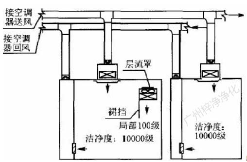 為了提高局部百級區(qū)氣流垂直層流效果,可以根據(jù)現(xiàn)場工藝設備高度及操作要求,適當降低局部百級區(qū)吊頂,或在潔凈區(qū)吊頂下直接拼裝 百級層流罩,并在百級區(qū)邊界處裝抗靜電塑料裙擋,如圖5。