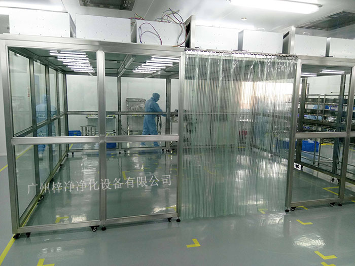 潔凈棚它主要從FFU頂部將空氣吸入,經(jīng)初效過(guò)濾器,高效過(guò)濾器過(guò)濾,過(guò)濾后的潔凈空氣在整個(gè)出風(fēng)面以0.45m/s±20%的風(fēng)速勻速送出到潔凈棚內(nèi)。形成均流層,使?jié)崈艨諝鈿饬鞒蚀怪眴蜗蛄鳎瑥亩WC了工作區(qū)內(nèi)所要求的潔凈度。潔凈棚等級(jí)通常分為百級(jí)潔凈棚,千級(jí)潔凈棚,萬(wàn)級(jí)潔凈棚。